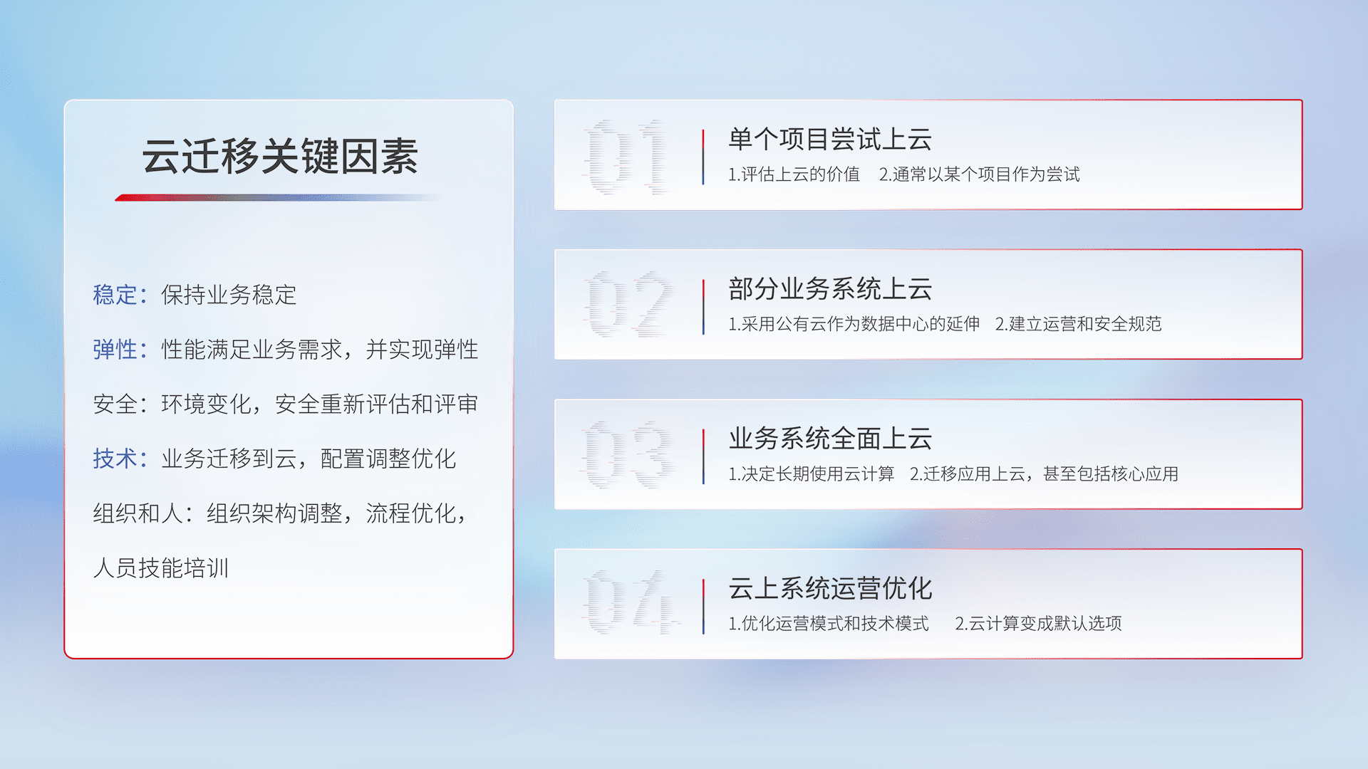结合实际业务,,,,从规划设计、、、云平台选型、、云原生改造、、、、数据迁移、、集成交付,,迁移全过程为客户识别最佳上云路径,,,做好风险识别管理,,,设计网络架构、、、身份权限、、安全审计合规、、、操作审计、、、、日志审计、、、、监控告警策略、、多站点容灾设计等,,对云上基础设施进行整体规划,,提升IT治理水平,,,以满足弹性、、、、高可用、、、、高性能的需求。。。。