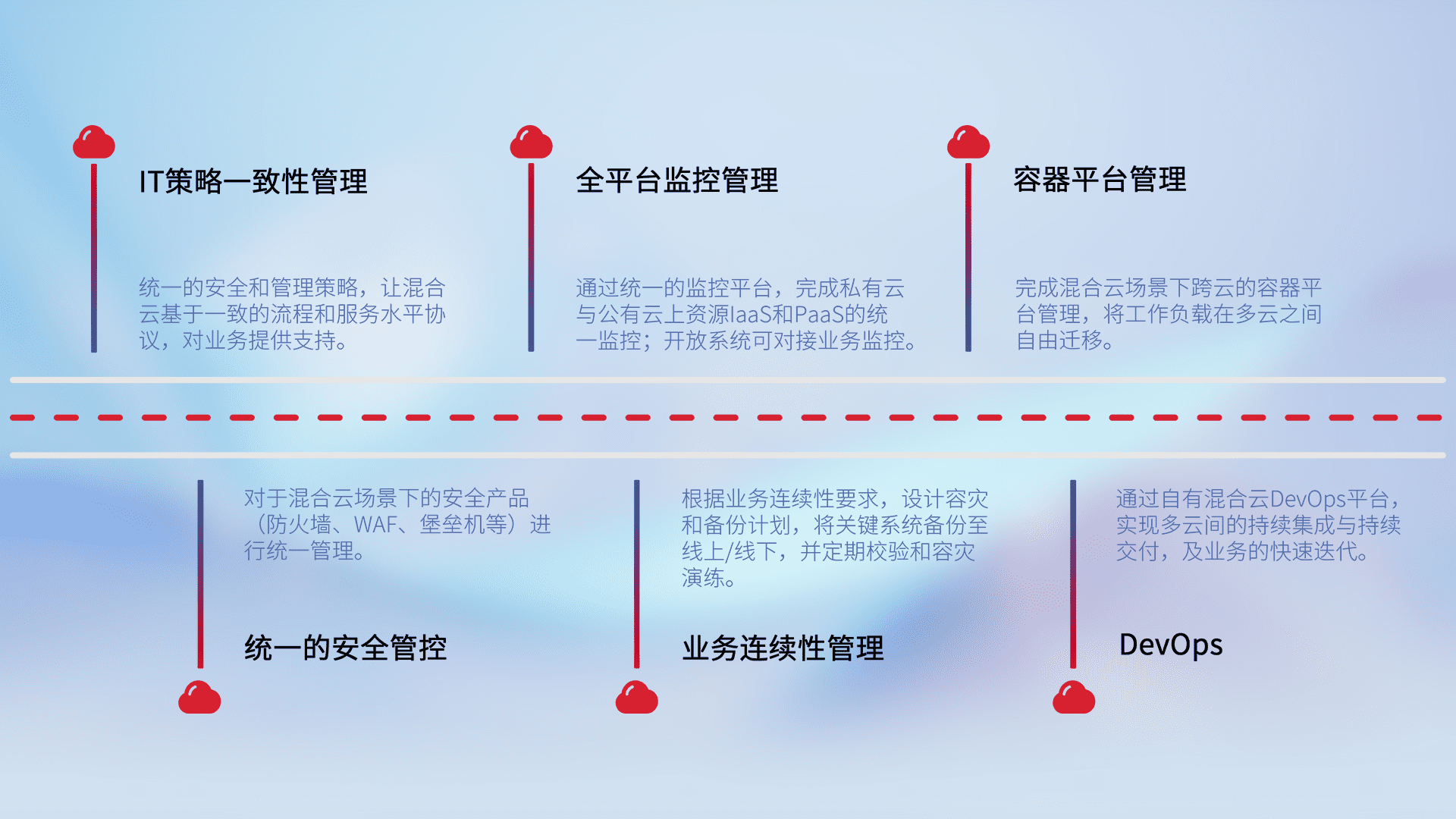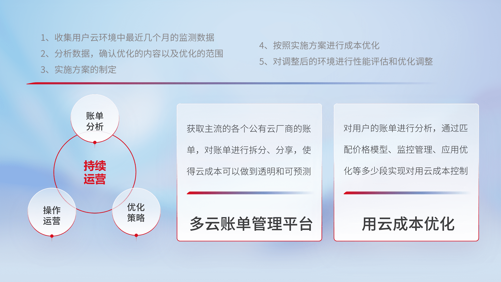 通过多云纳管,,,,以统一的资源数据模型把客户的云资源进行抽象和封装,,,进而实现对多云资源的统一操作,,,,保障云资源管理的可靠性、、、稳定性与可用性。。。量身定制化运维内容,,,,配置、、、开发运维、、补丁管理、、、备份、、监控、、认证和访问管理、、、、审计和日常巡检等,,保障在用云过程中的可靠度,,,,稳定度以及高可用率。。。