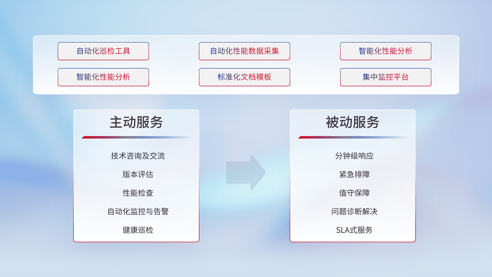智能化工具和标准化文档,,,,保障服务质量,,,提供主动服务(包含技术咨询、、、、版本评估、、性能检查、、自动化监控与告警、、、、健康巡检)和被动服务包含(分钟级响应、、紧急排障、、、、值守保障、、、、问题诊断解决、、、SLA服务)。。。
